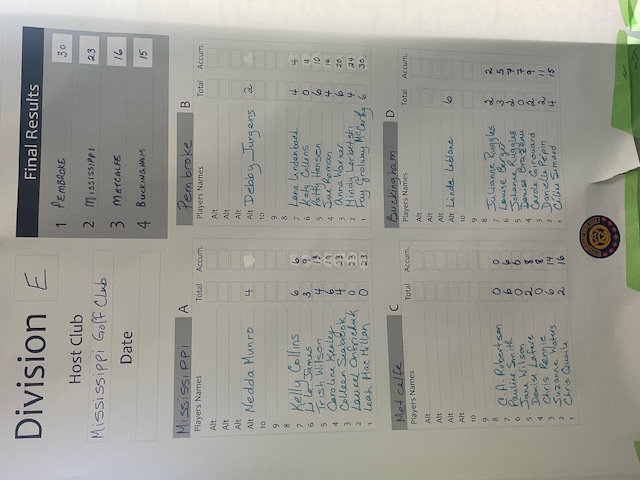 Team members qualify for this event through the best two of three rounds of a modified Stableford point system play. The team consists of 7 players plus an alternate. Congratulations to Mississippi who placed 2nd at home against Pembroke (1st), Metcalfe and Buckingham. The Division E event was cut short by stormy weather. Team members were Laurel Onfrichuk, Kelly Collins (6 points), Leah MacMillan, Colleen Seabrook, Lila James, Trish Wilson, Caroline Kealey (6 points) and Alternate Nedda Munro.